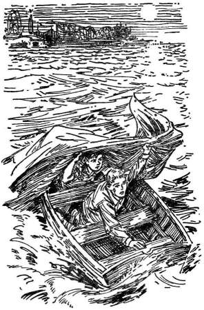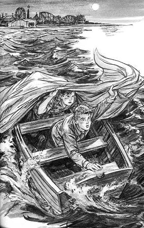 This illustration (Harry Kane's illustration on left, Roger Hall's illustration on right) shows Pete and Jupe after they've been set adrift in the ocean by the criminal.
