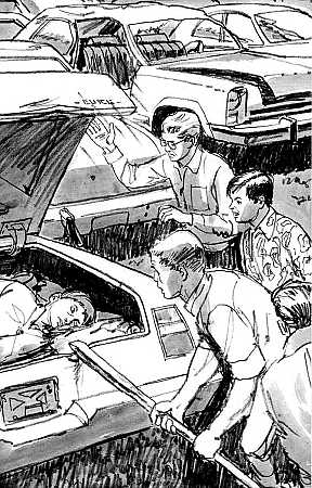 This illustration by Jack Hearne shows the rescue of Pete, who was knocked unconscious and locked inside a car trunk during the heat of the day.