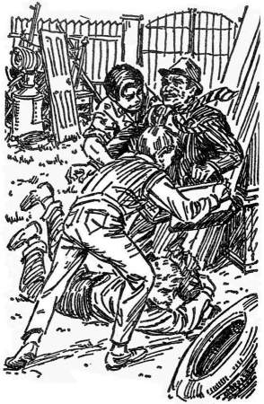 This illustration (Harry Kane's illustration on left, Roger Hall's illustration on right) shows the boys struggling with Jeeters after he tries to take the screaming clock from them.