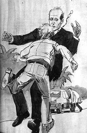 This illustration by Jack Hearne shows Bob running into a man while pursuing the burglar, who is escaping in a car.
