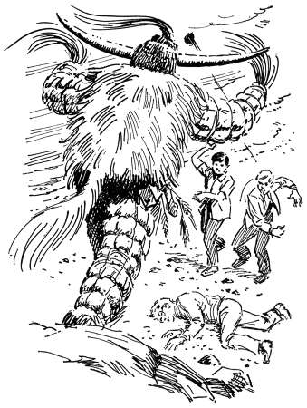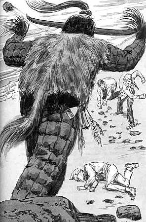 This illustration (Jack Hearne's on left, Roger Hall's on right) shows Jupe and Pete throwing rocks at the devil to drive him away from Bob, who fell while they were escaping from the devil.