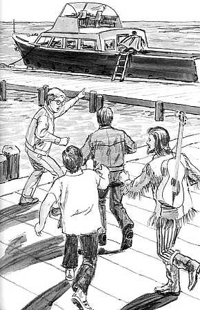 This illustration by Jack Hearne shows the boys with their friend Andy as they pursue the thief onto a boat.