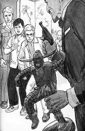 This illustration (Jack Hearne's on left, Roger Hall's on right) shows Jason Wilkes stealing the devil statue while Jim Clay and the boys watch helplessly.