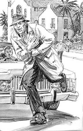 This illustration by Jack Hearne shows the pursuit of the tramp (none other than John Murphy) who recovered the ransom money for the Carpathian Hound.