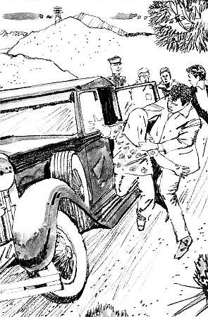 This illustration (Herb Mott's illustration on left, Roger Hall's illustration on right) shows Jupe being kidnapped from the Rolls Royce while Pete, Bob, and Worthington look on helplessly.