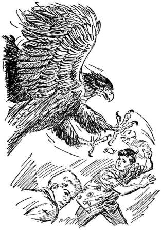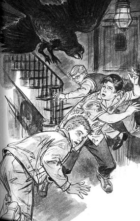 This illustration (Harry Kane's illustration on left, Roger Hall's illustration on right) shows the boys as they visit the home of Arthur Shelby and are greeted by one of Shelby's gadgets.