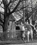 Group 4 This single photo puzzled me at first until I looked over all of the covers that Mr. Vebell drew and recognized that these are the boys drawn on the original hardback cover of The Mystery of the Shrinking House. Granted, they are shorter than the boys on that cover, but it would not be difficult to add some height in an illustration. The boy in the front of this photo is obviously the boy used as the model for Pete on that cover, and it explains somewhat why Pete's appearance was not consistent with Vebell's other covers: a different model was used. The boy at the rear of this photo was the model for Bob, although Vebell had to add glasses, but the nose and mouth features are unmistakable. Plus, the boys are drawn in a pose as though they are watching a house shrink from sight, which is exactly what Mr. Vebell ultimately drew on that cover. |