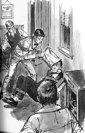 This illustration by Harry Kane shows Bob, Pete, and Chang discovering Harold Carlson after the supposed robbery of the Ghost Pearls.
