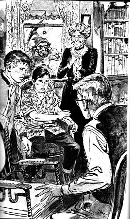 Although Roger Hall was not an illustrator for the US versions of the Three Investigators books, he deserves a special mention for his work in the UK editions of the books. The covers of the UK books were admirable replicas of the US versions, but Roger Hall brought his own talents to the internal illustrations. Usually he drew the same scenes as those chosen for the US versions, but whereas the US versions were drawn in shades of gray, Hall used line art in his illustrations. The result is a style that is somewhat more crude than that drawn by Harry Kane, but because Hall followed Kane's style when drawing, there is still a familiarity to the drawings. There is also a consistency in the UK editions that is missing in the US versions, since Hall illustrated the T3I series in the UK at least through "Deadly Double." Below are two scans that show the