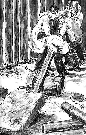 This illustration by Jack Hearne shows the boys and Diego lifting a large stone in a shack to see if it contains clues to the lost sword.