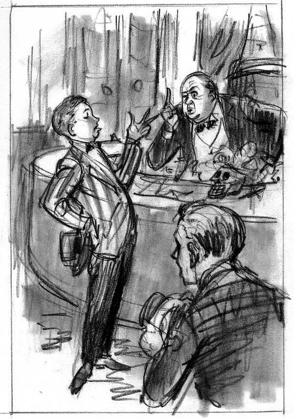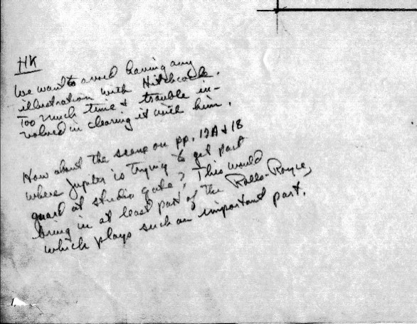 Kane realized that the most powerful scene in the early pages of Terror Castle was the scene in which Jupiter Jones does an impersonation of Alfred Hitchcock. It's a scene that is remembered worldwide as the scene whereby the Three Investigators get permission from Alfred Hitchcock to find a haunted house for him. Kane thus drew a rendition of that scene. Sadly, it would not make it into the final book. The editor (Walter Retan) made a note on the sketch pointing out the logistical nightmare associated with illustrating Hitchcock. Apparently, Hitchcock required that all likenesses of him be approved, and Retan did not want to slow down production of the book just to get Hitchcock's approval. Therefore, the illustration was changed, at Retan's suggestion, to the familiar scene where Jupiter impersonates Hitchcock at the studio gate.