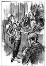 The original picture itself it quite interesting. First, there's the rendition of Jupiter and Pete, which is consistent with the other illustrations in the first two books. It's strange to see both boys carrying hats in this drawing, since hats do not appear in any drawings of the boys elsewhere. We can probably attribute the hats to the fact that the boys were formally dressed when they went to see Hitchcock.