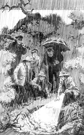 This illustration by Jack Hearne shows the boys, Cluny, Professor Shay, and Hans as they discover that someone has found the hidden treasure at Phantom Lake before they arrived.