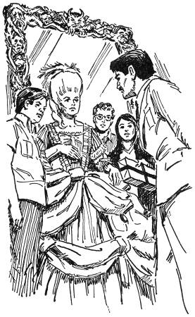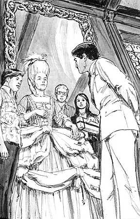 This illustration (Jack Hearne's on left, Roger Hall's on right) shows Jupe standing with Mrs. Darnley as she discusses the origin of the mirror with Senor Santora.