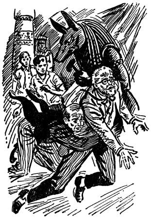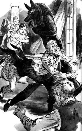 This illustration (Harry Kane's illustration on left, Roger Hall's illustration on right) shows Wilkins throwing himself at Professor Yarborough to avoid the falling statue of Annubis.