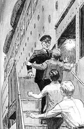 This illustration by Jack Hearne shows the boys as they try to get onto the "posh Queen" but are quickly stopped by the Captain.