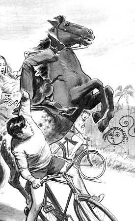This illustration by Ed Vebell shows Allie Jamison on her horse as the horse rears near Jupe.