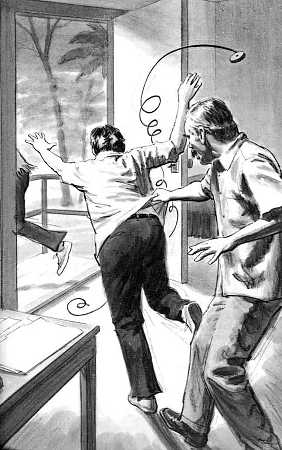 This illustration by Ed Vebell shows the boys barely escaping from Bentley's grasp when he comes home to discover them searching his apartment.