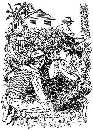 This illustration by(Harry Kane's on left, Roger Hall's on right) shows Bob and Jupe outside Albert Harris's home when they see the Yaquali Indians.