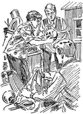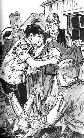 This illustration (Harry Kane's illustration on left, Roger Hall's illustration on right) shows the boys as they examine the contents of the trunk, including a skull named Socrates.