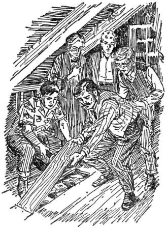 This illustration (Harry Kane's illustration on left, Roger Hall's illustration on right) shows the boys with Lonzo and Zelda as they find the money hidden under the attic floorboards.