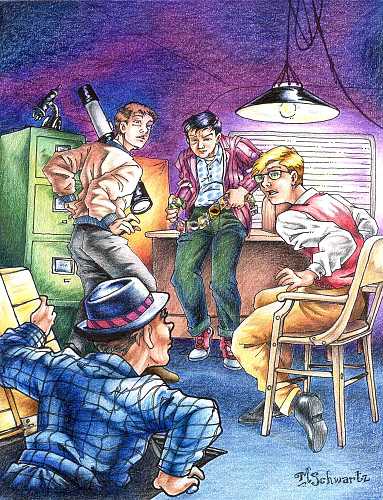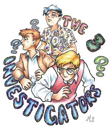 As you can see, Martha is a skillful artist and has drawn the boys in two different styles. The first drawing is an alternative to the cover illustration on "The Mystery of the Vanishing Treasure." The detail is astounding and unfortunately cannot be conveyed properly in a scan. In addition to the excellent drawing skill, Martha added some beads and glitter to the Golden Belt to give the appearance of real jewels. The second drawing is a more generic drawing of the three (such as what could be on a logo) and is more in the style of anime. Again, the detail and poses convey the sense of action associated with the series, and she placed some glitter around the lettering and question marks to give an added effect.