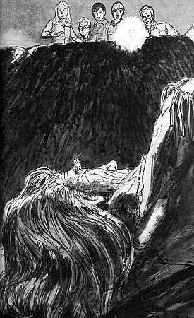 This illustration by Jack Hearne shows the boys with Allie and Thurgood shortly after Allie discovers the body in the mine.