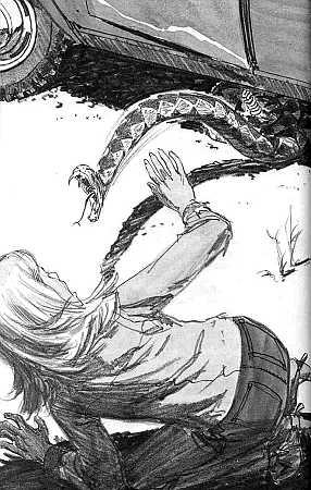 This illustration by Jack Hearne shows Allie's narrow brush with a rattlesnake at the ghost town where Allie and the boys have gone in search of Mrs. Macomber.